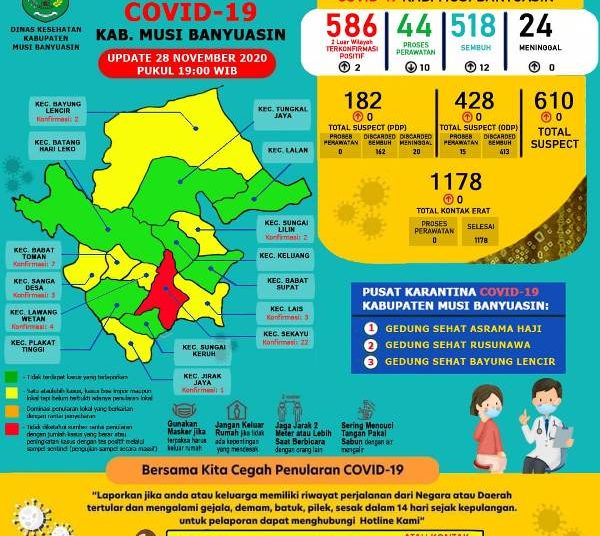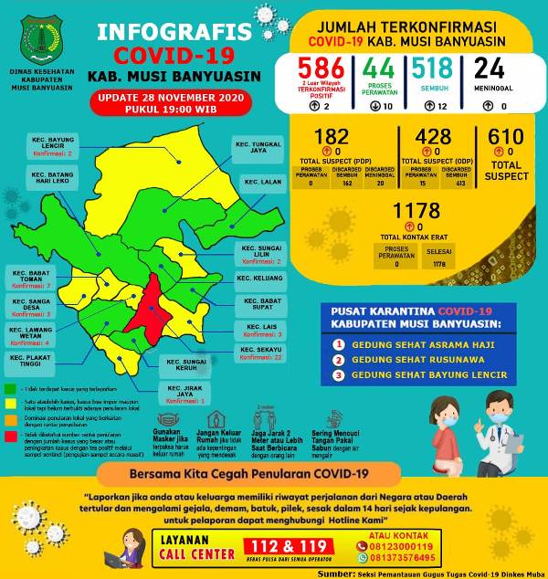 Diketahui, hingga 28 November 2020 ada 586 kasus konfirmasi di Muba dengan rincian 44 masih perawatan, 518 kasus sembuh, dan 24 meninggal dunia. Selain itu ada sebanyak 426 ODP dengan 411 selesai pemantauan dan masih dipantau 15 orang. Kemudian ada 1.178 kontak erat di mana semuanya telah selesai dilakukan pemantauan. Lalu ada 182 PDP dengan 162 selesai pengawasan dan 20 meninggal dunia. (ads/ije)