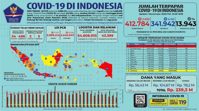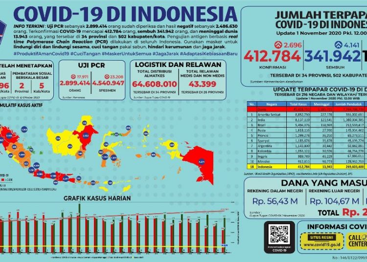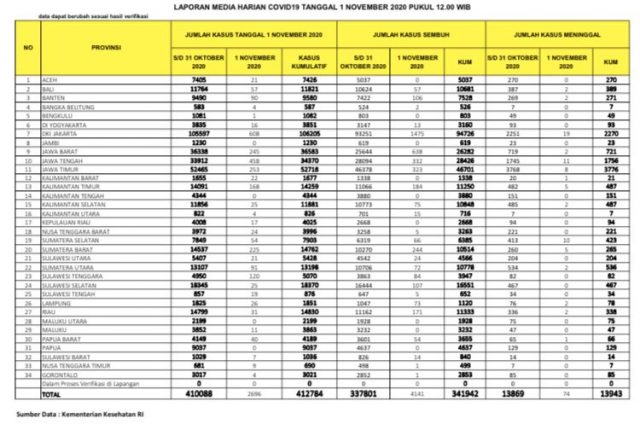 Data dari Kementerian Kesehatan RI, hingga 1 November 2020 pukul 12.00 WIB pemeriksaan per hari telah dilakukan terhadap 23.208 spesimen dari 17.971 orang. Dari 426 laboratorium yang melakukan pemeriksaan spesimen, ada 164 lab yang belum melaporkan hasil pemeriksaan PCR. Secara kumulatif spesimen yang diperiksa mencapai 4.540.947 dari 2.899.414 orang. (ads/ije)