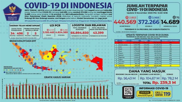 PALEMBANG, fornews.co – Awal pekan kedua bulan November, pertambahan kasus positif COVID-19 menunjukkan penurunan. Senin 9 November 2020 hingga pukul 12.00 WIB secara nasional dilaporkan kasus positif bertambah 2.853.