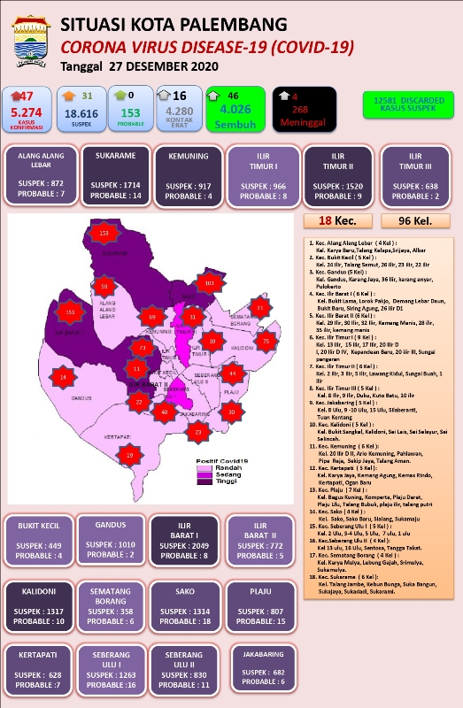 “Dengan bertambah kasus baru positif hari ini maka akumulasi jumlah konfirmasi positif Kota Palembang menjadi 5.274 kasus. Terdiri dari jumlah simptomatik 3.523 orang dan jumlah asimptomatik (OTG) 1.751 orang,” ujar Kasi Pencegahan dan Pengendalian Penyakit Menular Dinkes Palembang, Yudhi Setiawan, Minggu petang (27/12).
