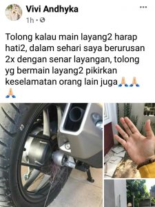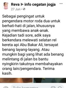 “Sebagai pengingat untuk pengendara motor roda dua untuk berhati-hati di jalan, khususnya yang membawa anak-anak. Kejadian tadi sore, adik saya berkendara melewati selatan rel kereta api Abu Bakar Ali, tersayat benang layang-layang. Atau mungkin bagi yang lihat ada benang melintang di jalan bisa bantu nyingkirin takutnya membahayakan orang lain/pengendara. Terima kasih,” katanya.