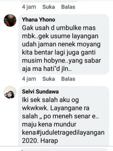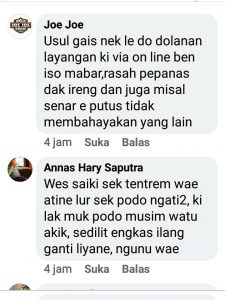 “Usul gais, kalau main layang-layang via online agar bisa mabar. Jangan berpanas-panasan agar tidak hitam. Dan misal benangnya putus tidak membahayakan orang lain,” katanya dalam Bahasa Jawa, Sabtu (11/7/2020).