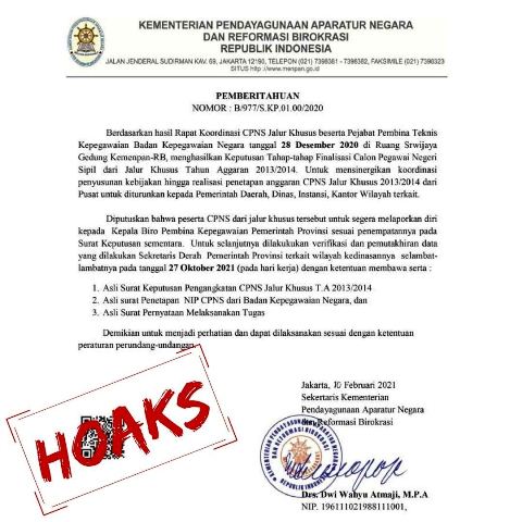 JAKARTA, fornews.co – Belakangan ini beredar surat melalui pesan singkat WhatsApp tentang Pengangkatan Calon Pegawai Negeri Sipil (CPNS) Jalur Khusus Tahun Anggaran 2013/2014. Kementerian Pendayagunaan Aparatur Negara dan Reformasi Birokrasi (PANRB) menegaskan bahwa surat tersebut adalah palsu (hoaks).