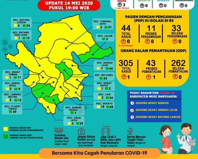 Povi menerangkan, hingga 14 Mei 2020 di Muba tercatat ada sebanyak 365 Orang Dalam Pemantauan (ODP) dengan ODP selesai pemantauan sebanyak 262 dan masih dipantau 43 orang. Sedangkan Orang Tanpa Gejala (OTG) 108, di mana 54 di antaranya selesai dipantau dan 54 lainnya masih dipantau. Untuk Pasien Dalam Pengawasan (PDP) berjumlah 44 orang.