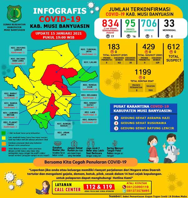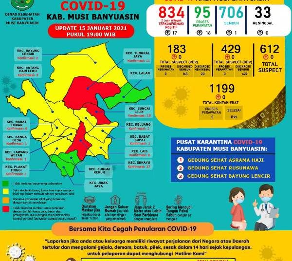 Dari 834 kasus Covid-19 di Muba hingga 15 Januari 2021 terdiri dari 706 kasus sembuh, 95 masih dirawat, dan 33 kasus meninggal dunia. Selanjutnya terdata sebanyak 429 ODP dan 1.199 kontak erat di mana seluruhnya selesai dilakukan pemantauan. Kemudian ada 183 PDP dengan 163 selesai pengawasan dan 20 meninggal dunia. (ije)