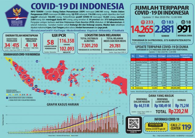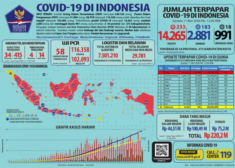 Sementara itu, dari update COVID-19 sampai dengan Senin 11 Mei 2020 pukul 12.00 WIB, Yuri menerangkan, upaya pemerintah hingga saat ini telah berhasil memeriksa 161.351 spesimen dari 116.358 orang. Hasilnya ada penambahan jumlah pasien konfirmasi positif sebanyak 233 orang sehingga total 14.265, pasien sembuh bertambah 183 total 2.881, sedangkan pasien meninggal bertambah 18 total 991. Sebanyak 373 kabupaten/kota telah terdampak di 34 provinsi.