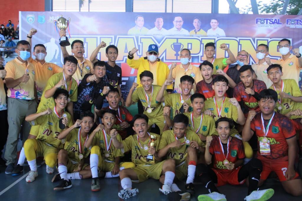 SEKAYU, fornews.co – Tim futsal Musi Banyuasin keluar sebagai juara Mini Turnamen Futsal U18 setelah mengalahkan Lubuklinggau dengan skor telak 6-1 di Stable Berkuda Sekayu, Kamis (18/3/2021).