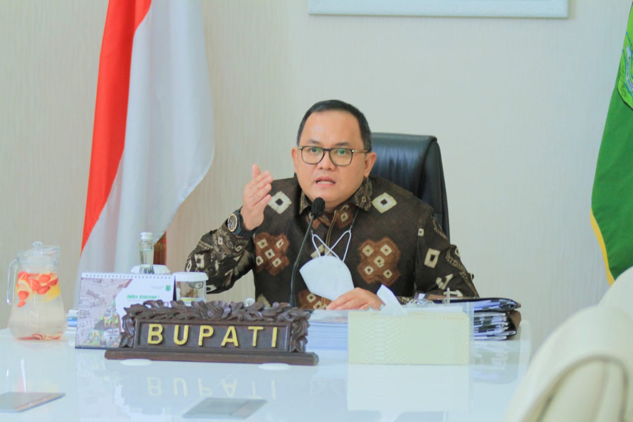 SEKAYU, fornews.co – Bupati Musi Banyuasin (Muba), Dodi Reza Alex memaparkan tentang inovasi pelayanan publik ‘Sirine Muba’ pada sesi wawancara dihadapan tim panel independent, di lingkungan Kementerian/Lembaga, Pemerintah Daerah/BUMN Tahun 2021 secara virtual di Guest House Griya Bumi Serasan Sekate, Jumat (2/7/2021).