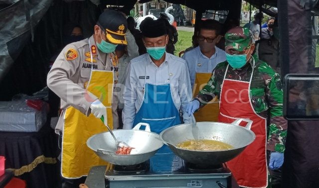 Pantauan di lapangan, usai masak-masak di dapur umum, masakan hasil kreasi unsur Forkompinda ini langsung dibagikan kepada masyarakat. (rif)