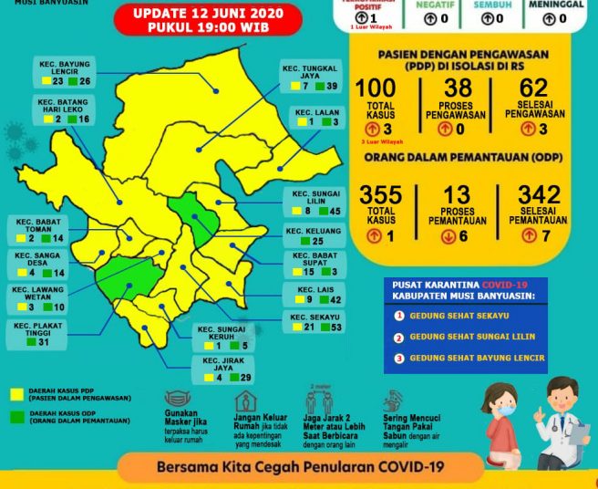 “Hari ini satu kasus positif COVID-19 kembali dinyatakan sehat dan sembuh. Tadi siang Camat Bayung Lencir bersama Forkopimcam Bayung lencir dan Direktur Rumah Sakit Bayung Lencir telah mengantarkan kepulangan pasien sembuh ke keluarganya. Meski telah dinyatakan sembuh, namun si pasien harus tetap menjalani isolasi mandiri selama 14 hari ke depan sesuai protokol kesehatan,” ujar Juru Bicara Gugus Tugas Percepatan Penanganan COVID-19 Kabupaten Muba Seftiani Pratita, Jumat (12/06) malam.