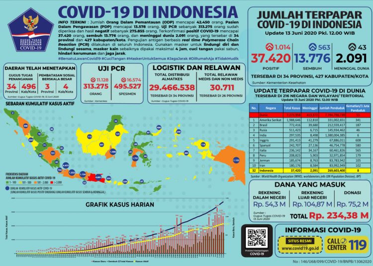 JAKARTA, fornews.co – Bertambah 1.014 kasus baru, akumulasi pasien positif COVID-19 di Indonesia hingga Sabtu 13 Juni 2020 mencapai 37.420.