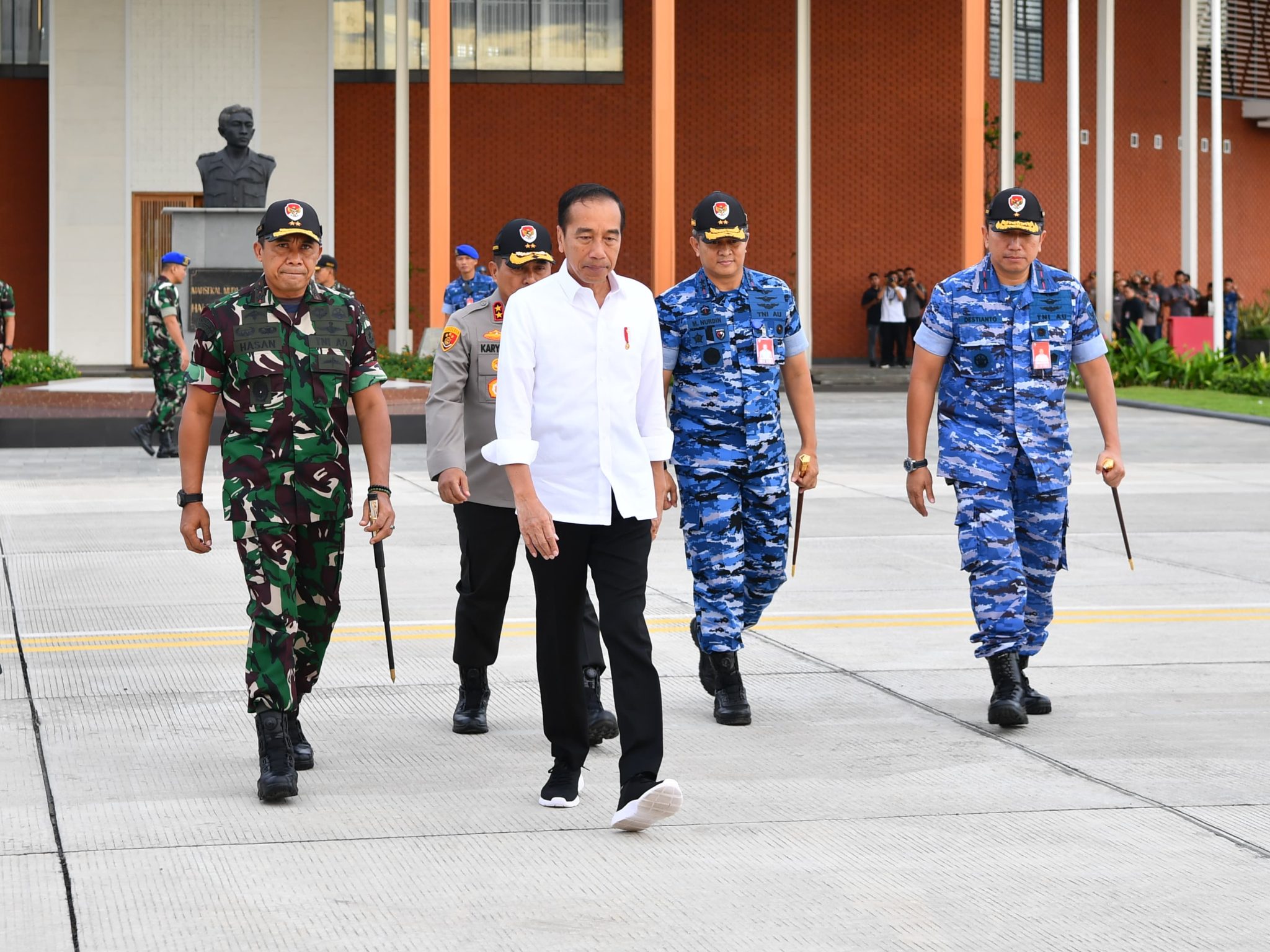 Saat mendengarkan penjelasan KSAU Marsekal Fadjar, Presiden Jokowi didampingi Menteri Pertahanan Prabowo Subianto dan Panglima TNI Jenderal Agus Subiyanto, untuk melihat kesiapan tiga pesawat tempur TNI AU, yakni dua pesawat F-16 dan satu pesawat T-50.
