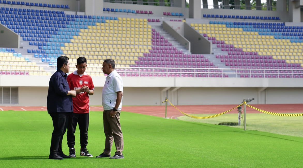 Seperti inspeksi di Stadion Gelora Sriwijaya Jakabaring Palembang dan Stadion Si Jalakharupat, Soreang, Bandung, Jumat dan Sabtu kemarin, Erick didampingi Menpora Zainuddin Amali, Wakil Ketua Umum PSSI Ratu Tisha.