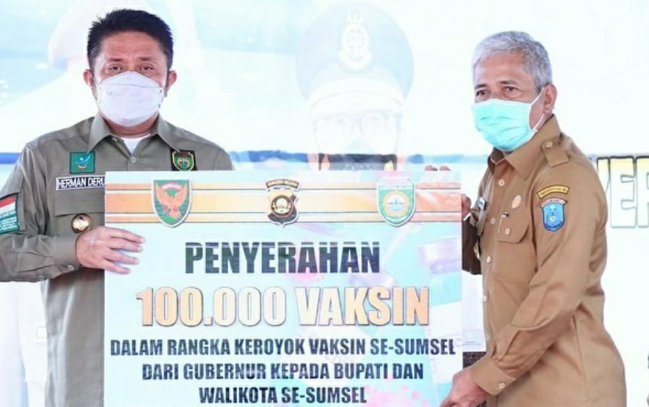 KAYUAGUNG, fornews.co – Bupati Ogan Komering Ilir (OKI), H Iskandar SE mewakili seluruh Kepala Daerah se-Sumatera Selatan menerima 100. 000 dosis vaksin Covid-19 dari Gubernur Herman Deru dan Forkopimda Sumatera Selatan, Senin (18/10/2021). Dosis ini selanjutnya akan dibagikan ke 17 Kabupaten kota se-Sumatera Selatan.