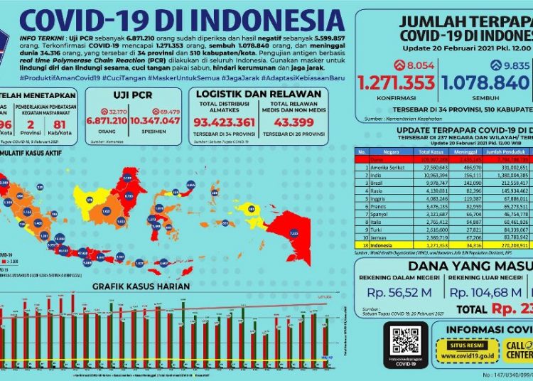 PALEMBANG, fornews.co – Kasus aktif Covid-19 di Indonesia pada Sabtu 20 Februari 2021 kembali berkurang 1.945 kasus sehingga akumulasi menjadi 158.197.