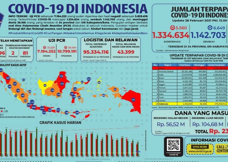 PALEMBANG, fornews.co – Kasus aktif Covid-19 di Indonesia pada Minggu 28 Februari 2021 kembali berkurang 1.274 kasus sehingga akumulasi menjadi 155.765.