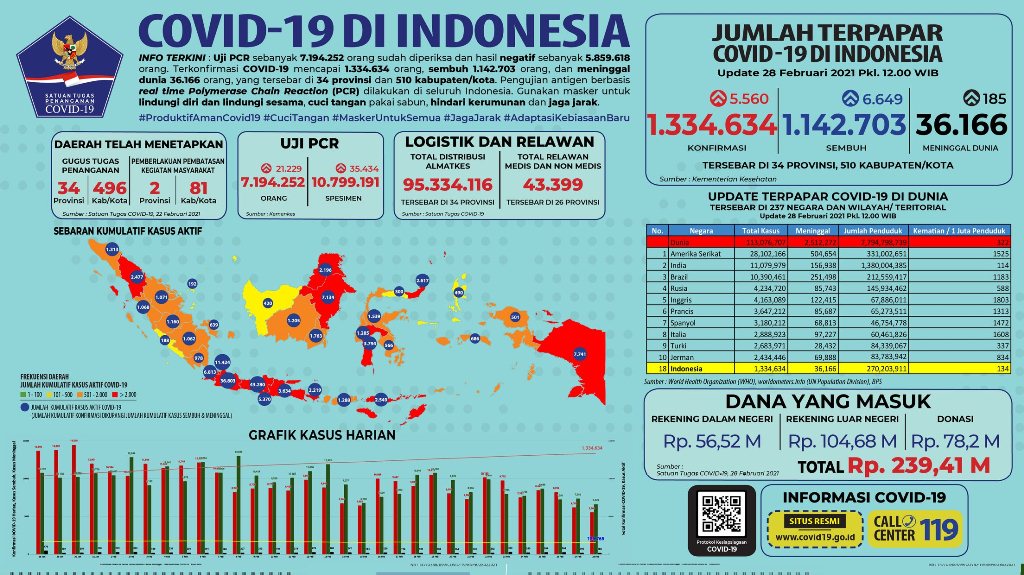 Data dari Kementerian Kesehatan RI, per 28 Februari 2021 hingga pukul 12.00 WIB pemeriksaan per hari telah dilakukan terhadap 35.434 spesimen dari 21.229 orang. Secara kumulatif spesimen yang diperiksa mencapai 10.799.191 dari 7.194.252 orang. Possitivity rate Indonesia hari ini 18,6%. (ije)