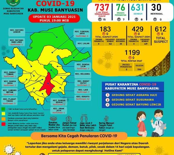 Hingga 3 Januari 2021 dari 737 kasus COVID-19 di Muba terdata 631 kasus sembuh, 76 masih dirawat, dan 30 kasus meninggal dunia. Selain itu ada sebanyak 429 ODP yang semuanya selesai dilakukan pemantauan. Lalu ada 1.199 kontak erat yang juga semuanya selesai dilakukan pemantauan. Kemudian ada 183 PDP di mana 163 selesai pengawasan dan 20 meninggal dunia. (ije)