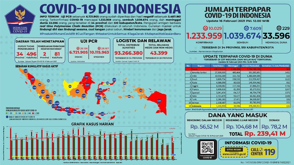 PALEMBANG, fornews.co – Penambahan kasus positif Covid-19 kembali naik Selasa 16 Februari 2021 sebanyak 10.029. Jawa Barat menjadi daerah terbanyak penambahan dengan 4.032.