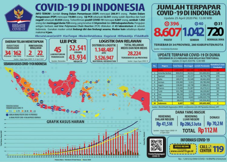 JAKARTA, fornews.co – Sebaran COVID-19 di Indonesia terus bertambah. Bahkan pada update Sabtu (25/04) hingga pukul 12.00 WIB jumlah kabupaten/kota yang terdampak COVID-19 bertambah 7 daerah.