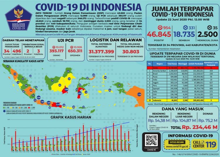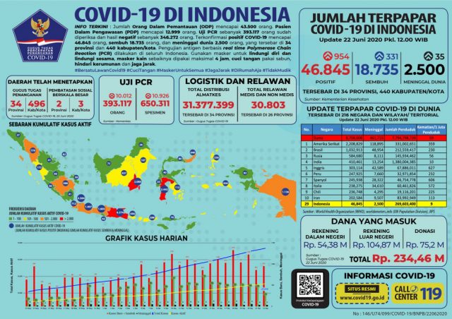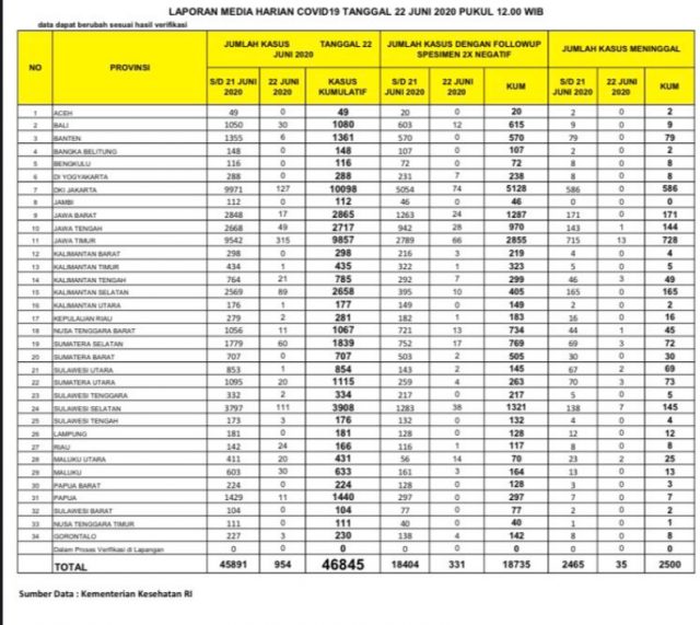 “Total spesimen yang diperiksa 650.311. Dari pemeriksaan itu kita dapatkan konfirmasi positif sebanyak 954 orang sehingga total 46.845,” ujar Yuri pada konferensi pers di Graha BNPB, Jakarta, yang disiarkan melalui kanal YouTube BNPB, Senin (22/06).