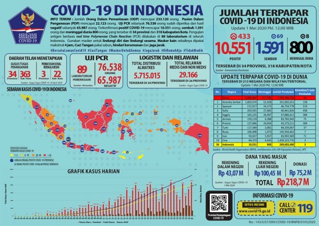 Juru Bicara Pemerintah untuk COVID-19 dr Achmad Yurianto mengatakan, pada update Jumat, 1 Mei 2020 hingga pukul 12.00 WIB, telah dilakukan pemeriksaan 102.305 spesimen dari 76.538 orang. Konfirmasi positif COVID-19 10.551 dan negatif 65.987. Dalam 24 jam terakhir tercatat penambahan kasus positif COVID-19 sebanyak 433 sehingga total 10.551.