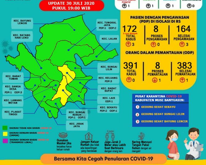 Data update 30 Juli 2020 Satuan Tugas Penanganan COVID-19 Muba melaporkan ada sebanyak 391 ODP dengan 383 di antaranya selesai pemantauan dan 8 orang masih dipantau. Lalu ada 543 OTG, 540 selesai pemantauan dan 3 masih dipantau. Kemudian terdapat 172 PDP di mana 8 proses pengawasan dan 164 selesai pengawasan. (ije)