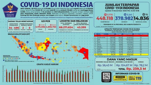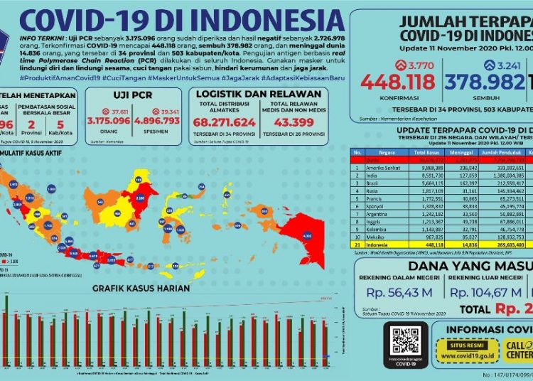 PALEMBANG, fornews.co – Satuan Tugas Penanganan COVID-19 melaporkan pada Rabu 11 November 2020 hingga pukul 12.00 WIB ada penambahan 3.770 kasus positif COVID-19 secara nasional.