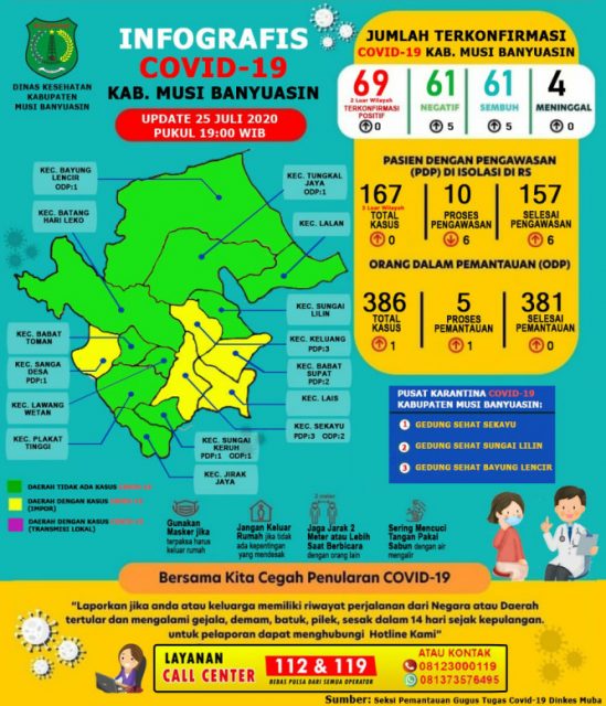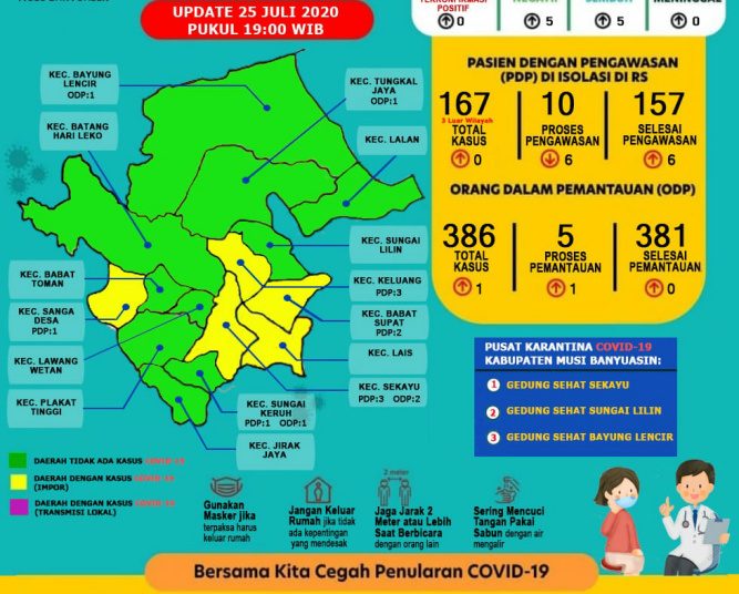 Sementara itu, data update 25 Juli 2020 Satuan Tugas Penanganan COVID-19 Muba melaporkan tercatat ada sebanyak 386 ODP di mana 381 selesai pemantauan dan masih dipantau 5 orang, 540 OTG dengan 462 selesai pemantauan dan 77 masih dipantau, 167 PDP di mana 10 proses pengawasan dan 157 selesai pengawasan. (ije)