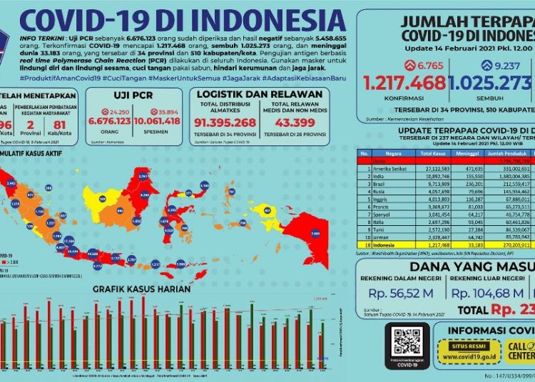 Data dari Kementerian Kesehatan RI, per 14 Februari 2021 hingga pukul 12.00 WIB pemeriksaan per hari telah dilakukan terhadap 35.894 spesimen dari 24.250 orang. Secara kumulatif spesimen yang diperiksa mencapai 10.061.418 dari 6.676.123 orang. Possitivity rate Indonesia hari ini tetap di angka 18,2%. (ije)