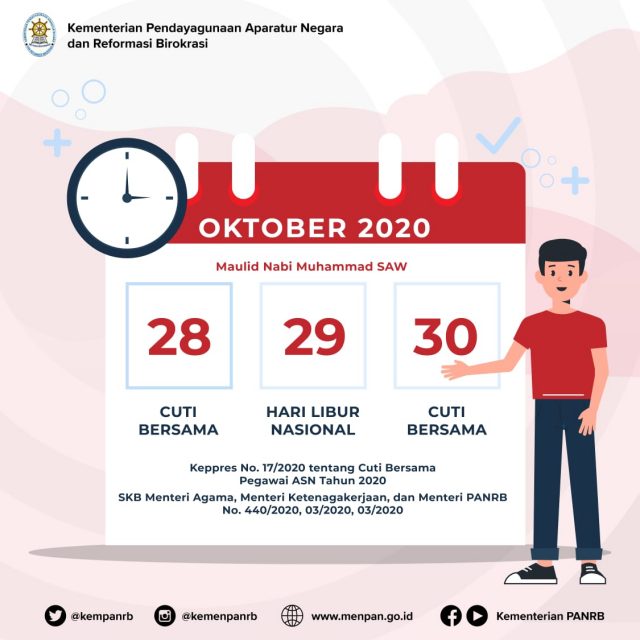 “Nah dalam SKB itu, tanggal 28 dan 30 Oktober 2020 merupakan cuti bersama, yang tanggal 29 Oktober itu adalah Maulid Nabi Muhammad SAW,” jelas Dwi, Selasa (27/10).