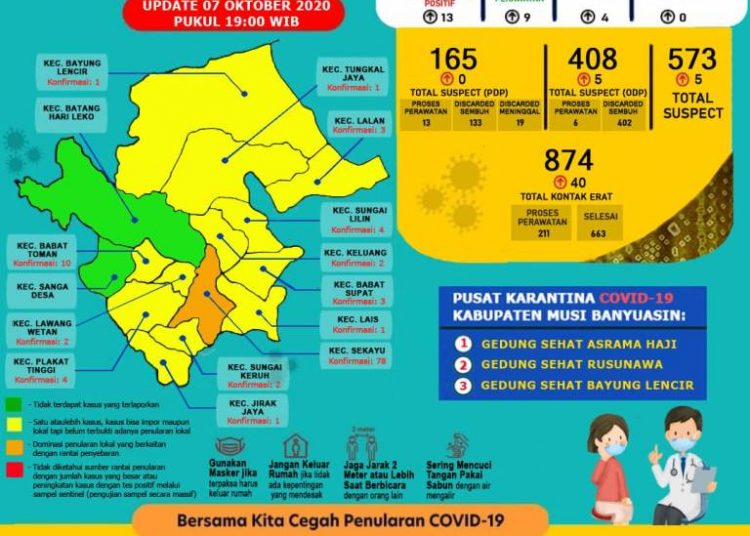 SEKAYU, fornews.co – Kasus konfirmasi positif Covid-19 di Kabupaten Musi Banyuasin terus mengalami peningkatan. Hari ini Rabu 7 Oktober 2020 ada penambahan 13 kasus positif.