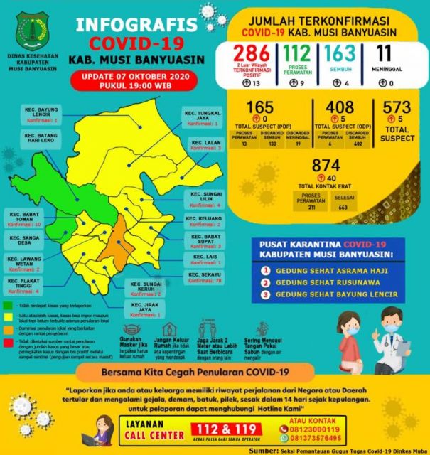 Update Satuan Tugas Penanganan Covid-19 Muba hingga 7 Oktober 2020, ada sebanyak 286 kasus terkonfirmasi di Muba dengan rincian 163 kasus sembuh, 11 meninggal dunia, dan 112 orang masih dirawat. Sementara itu, untuk ODP ada 408 dengan 6 selesai pemantauan dan 402 orang masih dipantau. Lalu ada 874 kontak erat di mana 663 kontak selesai pemantauan dan 211 kontak erat yang masih dipantau. Kemudian untuk PDP ada 165 dengan 13 proses pengawasan dan 133 selesai pengawasan, serta 19 meninggal dunia. (ads/ije)