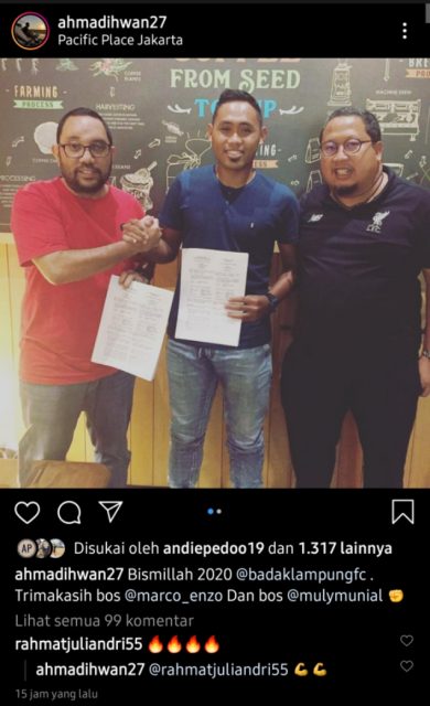 “Bismillah 2020 @badaklampungfc. Trimakasih bos @marco_enzo Dan bos @mulymunial ✊,” tulis Ihwan. (ije)