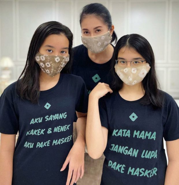 Thia pun tampak kompak bersama buah hatinya mengenakan masker Gambo Muba dan kaos berisi ajakan menggunakan masker. Foto itu pun diposting di akun Instagram pribadi Thia.