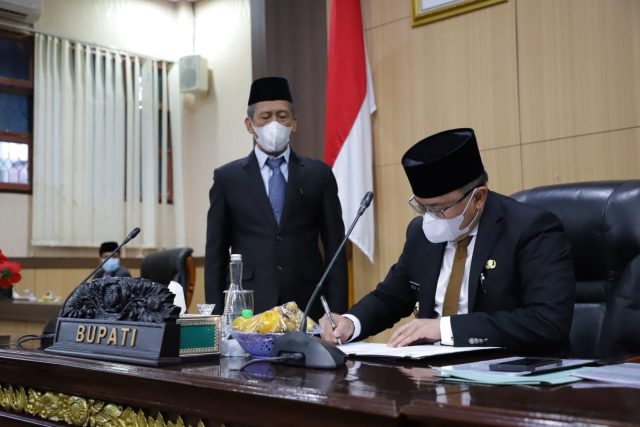 Persetujuan bersama Raperda menjadi Perda Kabupaten Muba ini ditandatangani oleh Bupati Muba Dodi Reza Alex dan Pimpinan DPRD Muba, pada Rapat Paripurna Masa Persidangan I Rapat ke-41, di Ruang Rapat Paripurna DPRD Muba, Senin (30/11/2020).
