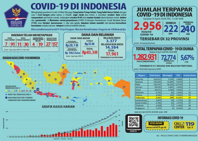 “Untuk pasien yang sembuh bertambah 18 sehingga total menjadi 222. Dan yang meninggal bertambah 19 orang sehingga menjadi 240,” tukasnya. (ije)