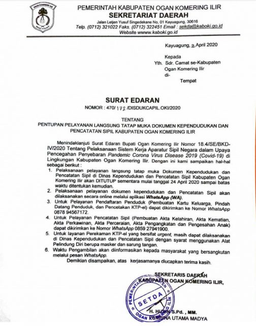 Melalui Surat Edaran Nomor : 470/172/Disdukcapil OKI/2020, Pemerintah Kabupaten (Pemkab) Ogan Komering Ilir (OKI) menyatakan bahwa pelaksanaan pelayanan langsung tatap muka dokumen Dukcapil di Kantor Disdukcapil OKI akan ditutup sementara mulai 24 April 2020 hingga batas waktu yang tidak ditentukan.