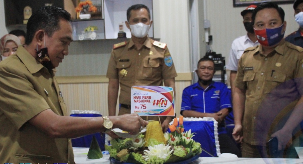 Sebagai wujud syukur wartawan yang biasa bertugas di Kabupaten OKU Selatan, usai mengikuti Peringatan HPN Ke-75 Tahun 2021 bersama Asisten III Bidang Administrasi Umum laksanakan Potong Tumpeng bersama. (ril)