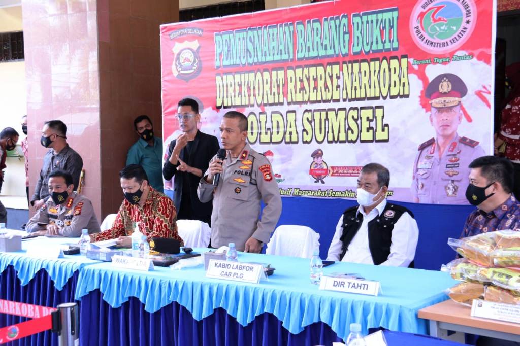 Pemusnahan barang bukti tersebut dipimpin Wakapolda Sumsel, Brigjen Rudi Setiawan didampingi Direktur Ditres Narkoba Kombes Heri Istu, dan Kabid Humas Kombes Supriadi. Menurut Rudi, barang bukti Narkoba tersebut diamankan dari 16 tersangka tindak pidana narkoba dengan 12 Laporan Polisi (LP). Sebanyak 16 orang tersangka yang ditangkap terbukti sebagai pengedar atau kurir berasal dari Palembang dan luar Provinsi Sumsel.