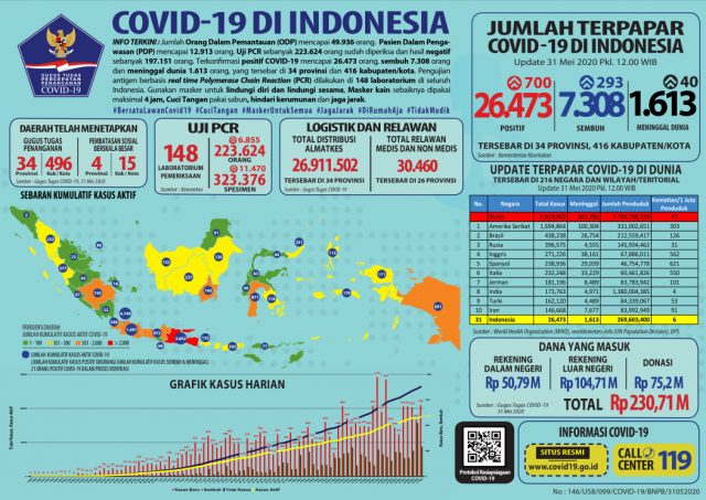 “Konfirmasi positif COVID-19 naik 700 orang sehingga menjadi 26.473 orang,” ujar Juru Bicara Pemerintah untuk COVID-19 dr Achmad Yurianto dalam keterangan resmi di Media Center Gugus Tugas Percepatan Penanganan COVID-19, Graha Badan Nasional Penanggulangan Bencana (BNPB), Jakarta, Minggu (31/05).