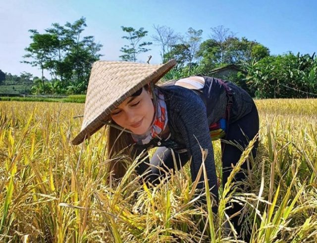 Dengan masih menggunakan atribut bersepeda, Luna terlihat tengah menikmati suasana persawahan.