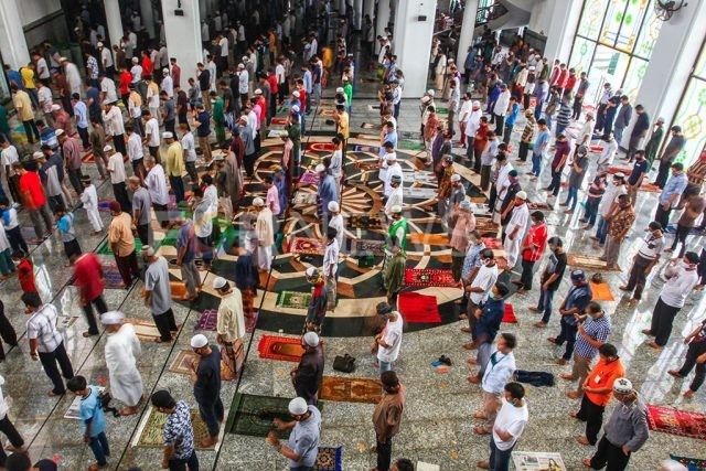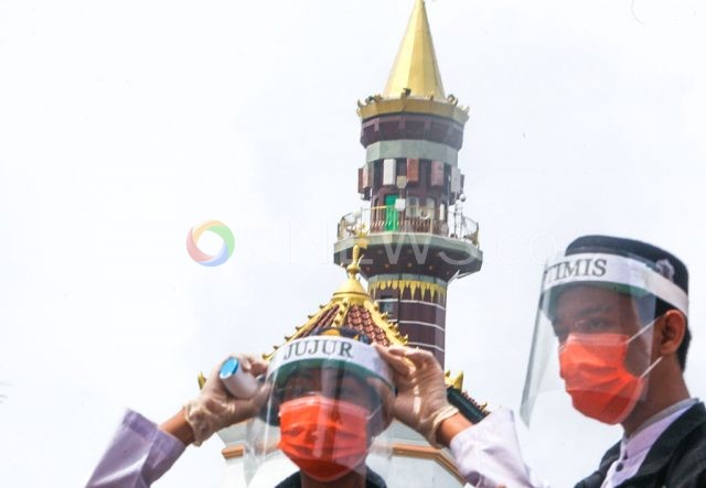 Ribuan umat muslim pun berduyun-duyun mendatangi masjid di tengah Kota Palembang ini, Jumat (05/06/2020), untuk melaksanakan salat Jumat. Namun sebelum itu, para jemaah yang akan masuk ke masjid harus menggunakan masker, diperiksa suhu tubuh, mencuci tangan, dan menjaga jarak ketika di dalam masjid. (matakamera/fornews.co/mushaful imam)