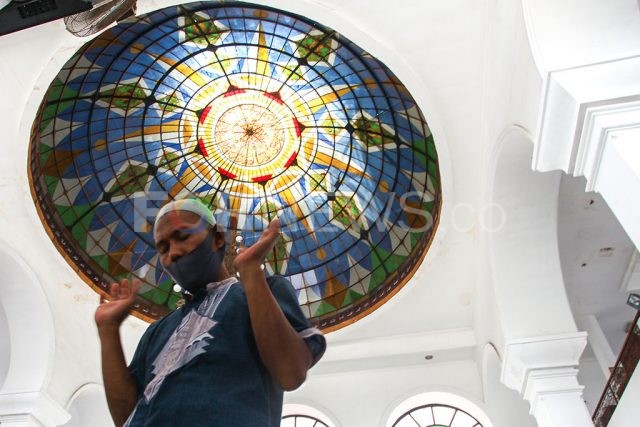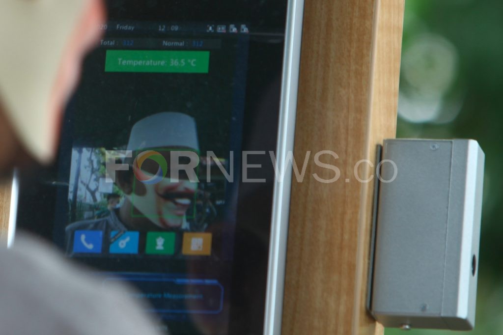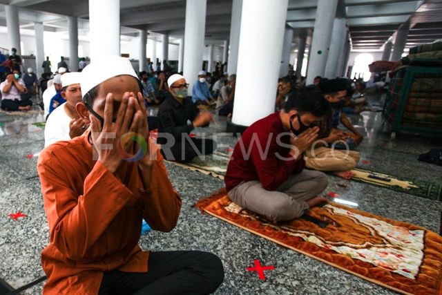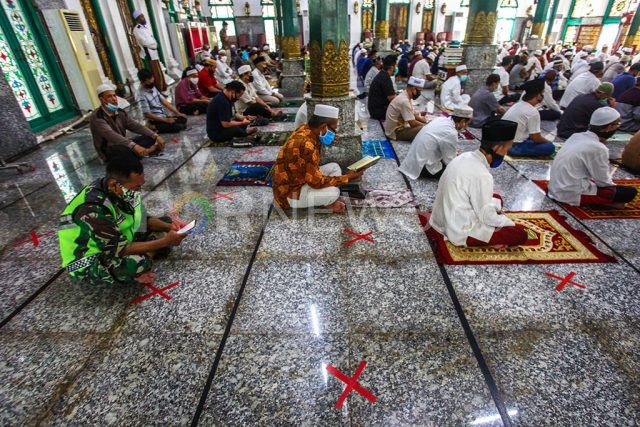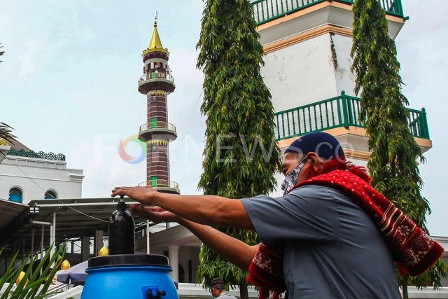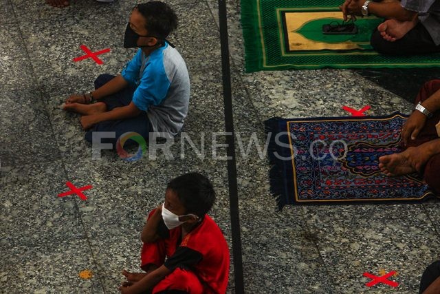 Jemaah diperiksa suhu tubuhnya dengan alat digital. (matakamera/fornews.co/mushaful imam)Jemaah mencuci tangan sebelum masuk ke dalam masjid. (matakamera/fornews.co/mushaful imam)Penerapan jaga jarak bagi jemaah saat dalam masjid. (matakamera/fornews.co/mushaful imam)