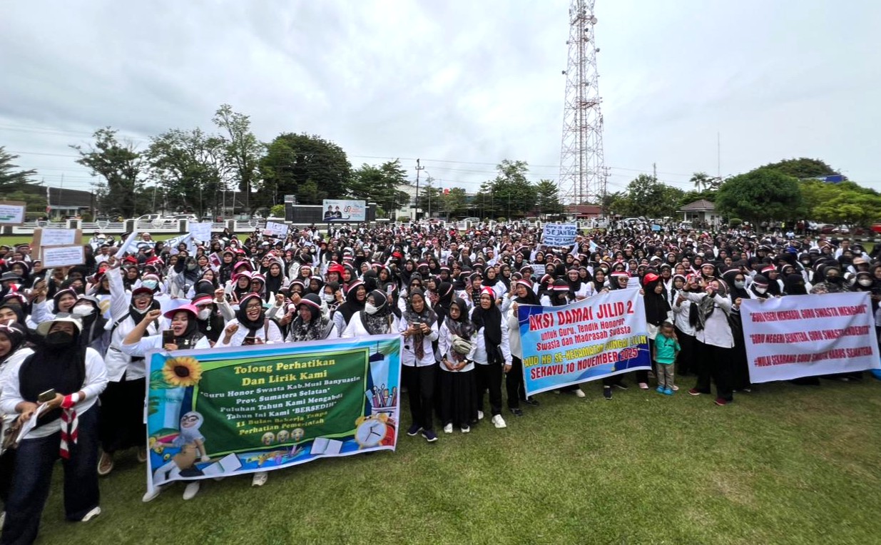 Tuntutan tersebut disampaikan ratusan massa GM Pro yang terdiri dari guru TK, PAUD, SD, SMP, dan Madrasah Swasta dari berbagai kecamatan di Kabupaten Muba, pada aksi damai di halaman Kantor Bupati Muba, Senin (10/11/2025).