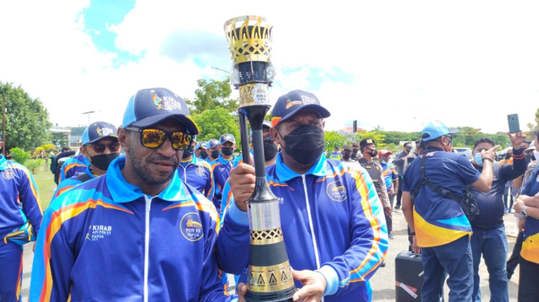 SORONG, fornews.co – Dua mantan atlet Papua, Ronny Wabia dan Ortizan Solossa, menerima Api Pekan Olahraga Nasional (PON) XX Papua, dari Kabupaten Sorong, Papua Barat, menuju lima wilayah adat di Papua, Senin (27/9/2021) pagi.