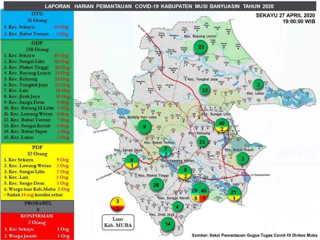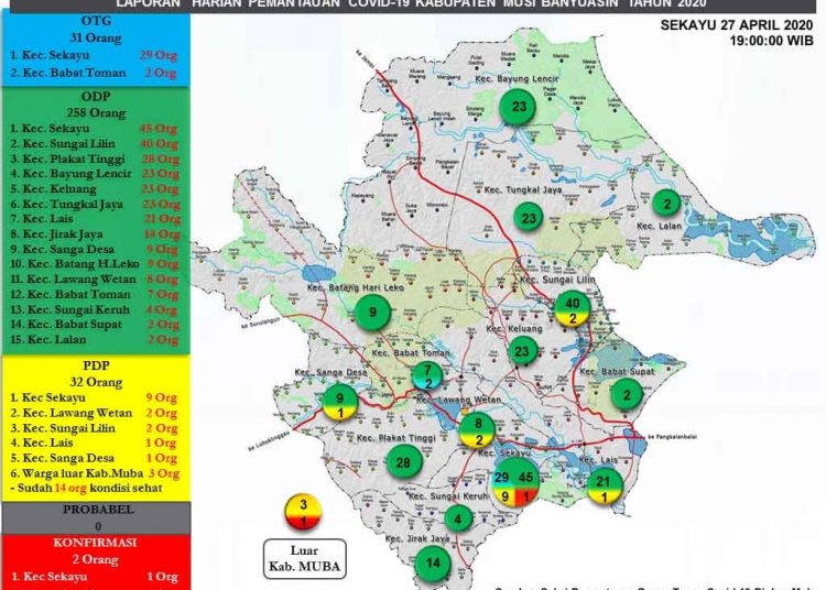 Menurut Lingga, berdasarkan data yang dihimpun Gugus Tugas COVID-19 Muba per 27 April 2020 tercatat ada sebanyak 258 ODP dengan jumlah ODP selesai pemantauan 215 orang dan jumlah ODP masih dipantau 43 orang, 31 OTG, dan 32 PDP.
