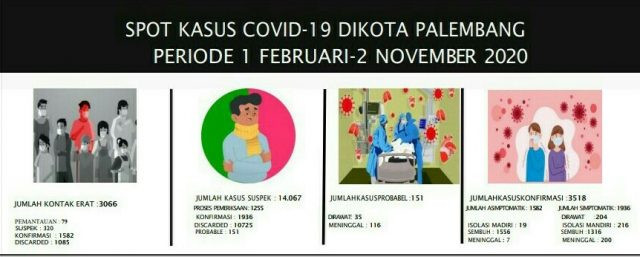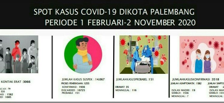 PALEMBANG, fornews.co – Dinas Kesehatan Kota Palembang melaporkan situasi perkembangan COVID-19 di Kota Palembang pada Senin 2 November 2020 dengan penambahan 8 konfirmasi positif.