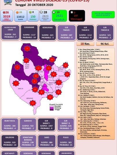 PALEMBANG, fornews.co – Kasus konfirmasi positif Covid-19 di Kota Palembang bertambah 26 orang per 20 Oktober 2020. Dengan penambahan kasus baru ini maka total jumlah konfirmasi positif menjadi 3.319 orang.