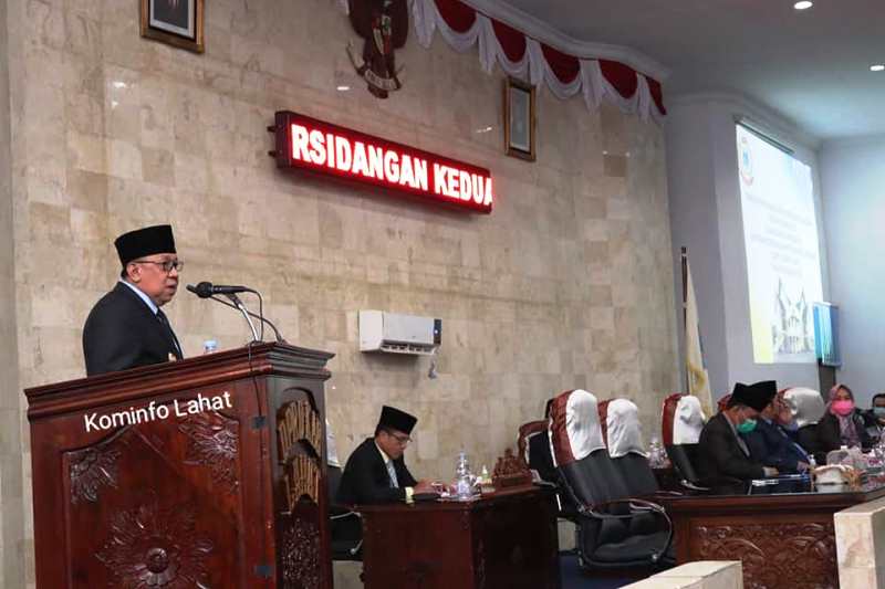Rapat paripurna dihadiri juga Ketua DPRD Lahat Fitrizal Homizi, Wakil Ketua ll DPRD Lahat Sri Mulyati, Forkopimda, Pj Sekda Lahat Deswan Irsyad, para asisten Setda Lahat, Kepala Kanmenag, Komandan Sub Denpom, Anggota DPRD Lahat, dan jajaran OPD, serta undangan lainnya. (aha)